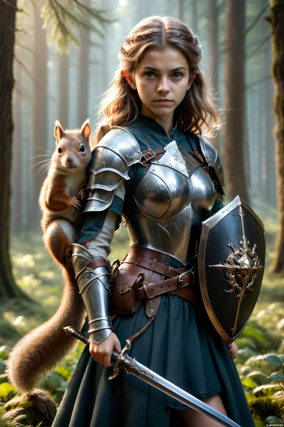 На картинке изображена женщина в средневековых доспехах с мечом, стоящая на фоне лесного пейзажа с поросшими мхом деревьями. У неё длинные волосы, и она задумчиво смотрит вдаль. На плече у неё сидит маленький зверек, похожий на белку, а на ней также надета туника, выполненная в историческом стиле.