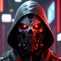 The image features a character with a robotic appearance wearing a hooded cloak and goggles, set against what appears to be a futuristic background. The character's face is obscured by a metallic mask with red eyes, which gives the impression of an artificial or mechanical being. There are visible lines and mechanisms that suggest parts of the robotic design. Additionally, there are straps and possibly wrist-mounted devices, indicative of some form of armor or weaponry system attached to the character's body. The overall aesthetic is reminiscent of science fiction genres often associated with advanced technology, cybernetics, or robotic characters.