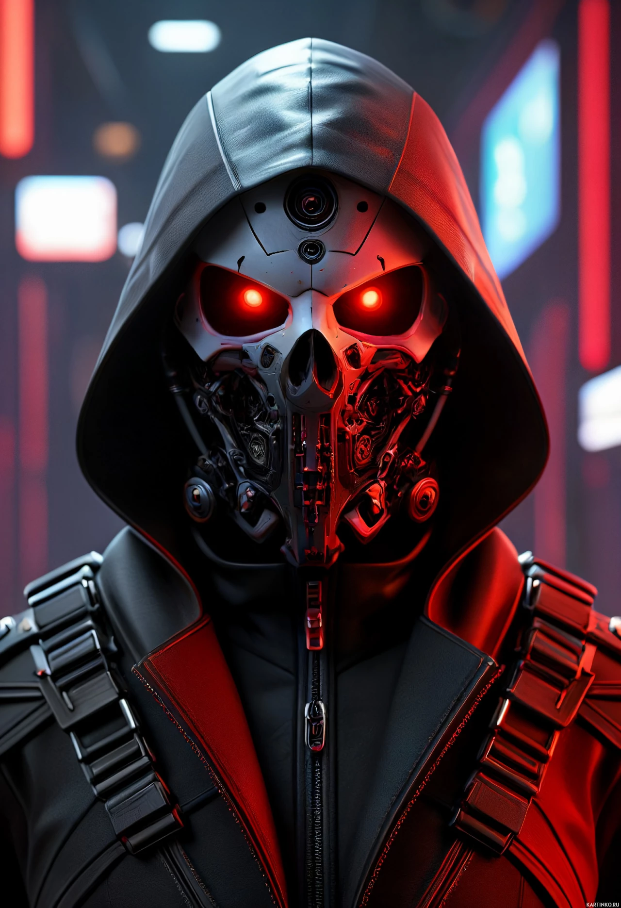 На картинке изображён персонаж с роботизированной внешностью, одетый в плащ с капюшоном и очки, на фоне, похоже, футуристического пейзажа. Лицо персонажа скрыто металлической маской с красными глазами, что создаёт впечатление искусственного или механического существа. Видны линии и механизмы, намекающие на конструкцию робота. Кроме того, присутствуют ремни и, возможно, устройства на запястьях, указывающие на форму брони или систему вооружения, прикреплённую к телу персонажа. Общая эстетика напоминает научно-фантастические жанры, часто связанные с передовыми технологиями, кибернетикой или роботами.