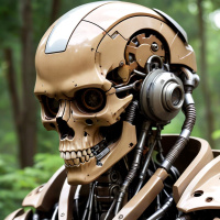 The image features a humanoid robot with a skull for a head, which is an often-used design element in science fiction genres to convey themes of artificial intelligence and humanity. The robot's complex mechanism includes visible circuitry, gears, and wires on its face and neck, suggesting advanced technology. It stands among natural vegetation, indicating an outdoor setting that contrasts with the mechanical nature of the robot.