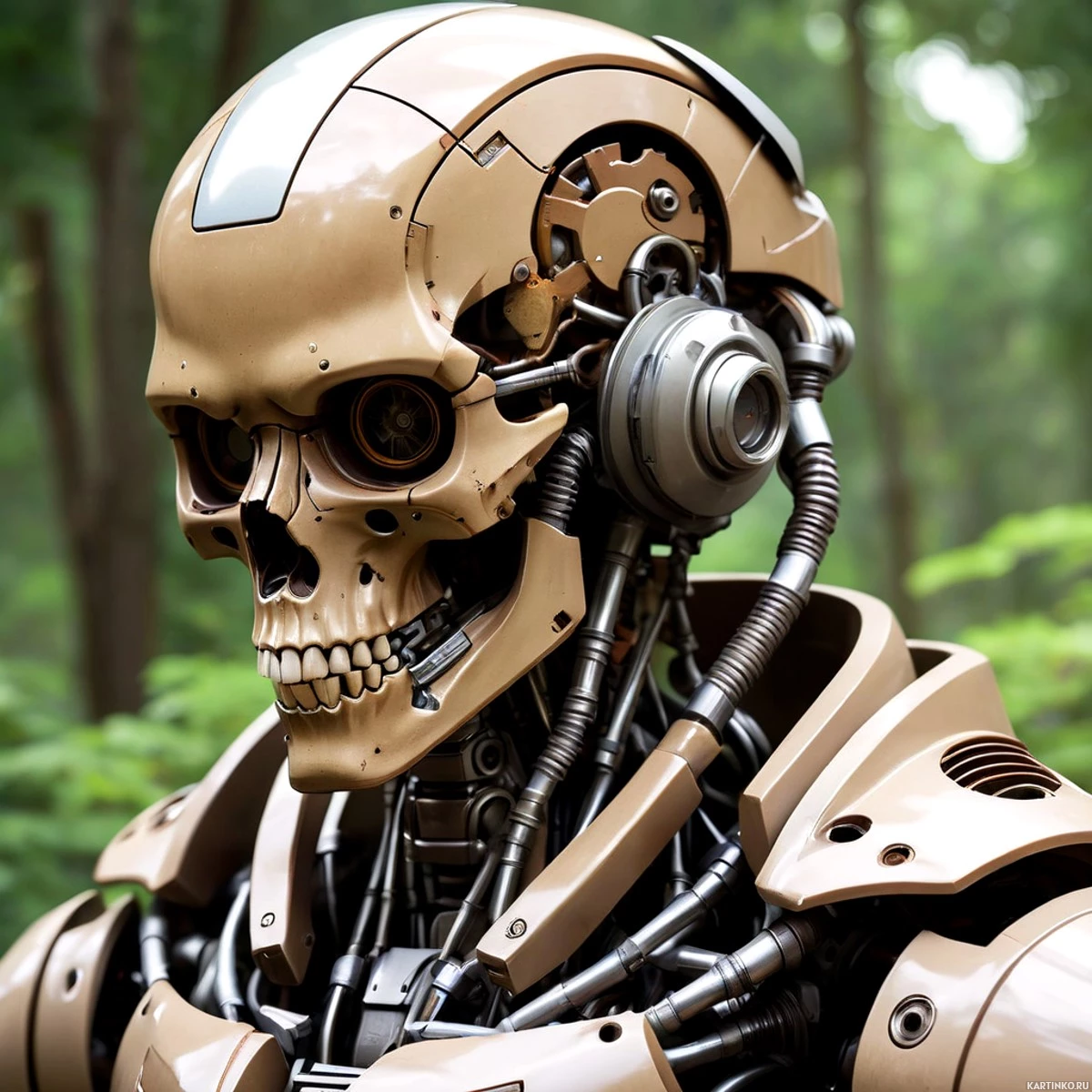 На картинке изображен гуманоидный робот со черепом вместо головы – распространенный прием в научной фантастике, используемый для передачи тем искусственного интеллекта и человечности. Сложный механизм робота включает видимые схемы, шестерни и провода на лице и шее, что указывает на передовые технологии. Он стоит среди естественной растительности, что создает контраст с механической природой робота.
