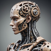 The image features a humanoid robot with a very human-like face. It has detailed facial features such as eyebrows, eyes, nose, and lips. The robot's head is encased in what appears to be metallic components resembling the structure of bone or skeletal material. On the surface of its head are mechanical parts that could be interpreted as machinery or gears.