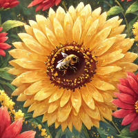 На картинке возвышается большой подсолнух, чьи яркие лепестки окружают пустоту в его сердце. В этой нише укрылось маленькое существо. Семечки у подсолнуха не видны. Вокруг него – два более мелких цветка, по одному с каждой стороны, с желтыми серединками и красными лепестками. На этих цветах тоже заметна пыльца. На заднем плане можно заметить нескольких пчел, возможно, привлеченных цветущими растениями. Картинка полна цвета и деталей, запечатлевает момент природного спокойствия.