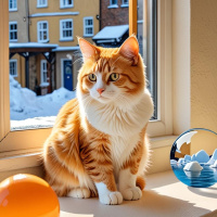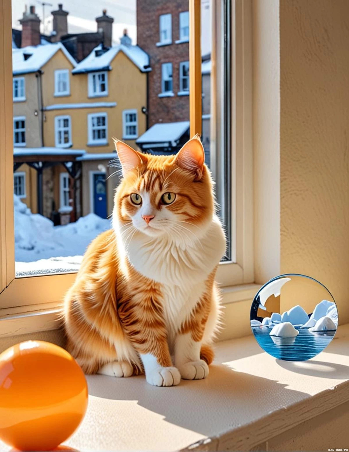 На картинке кошка сидит на подоконнике в комнате, залитой солнечным светом, создающим теплую атмосферу. Кажется, она смотрит в окно, слегка наклонив голову. Рядом с кошкой – два шара: один оранжевый, другой – голубой, расположенные близко друг к другу. На заднем плане видны дома с фасадами в традиционном стиле, что говорит о том, что это, вероятно, старая или историческая часть города. На картинке никого нет.
