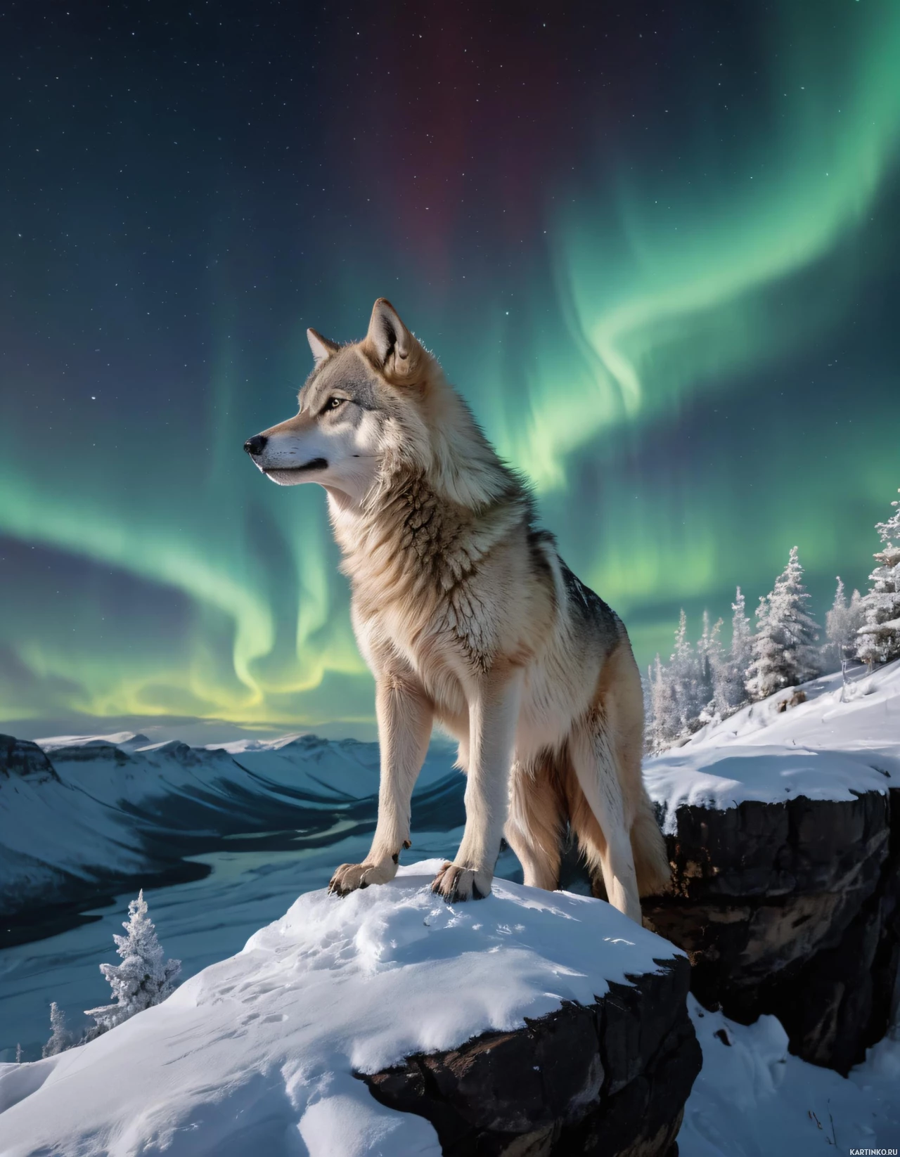 На картинке волк сидит на скальном выступе, покрытом снегом, на фоне захватывающего неба, полного северного сияния и звёзд.