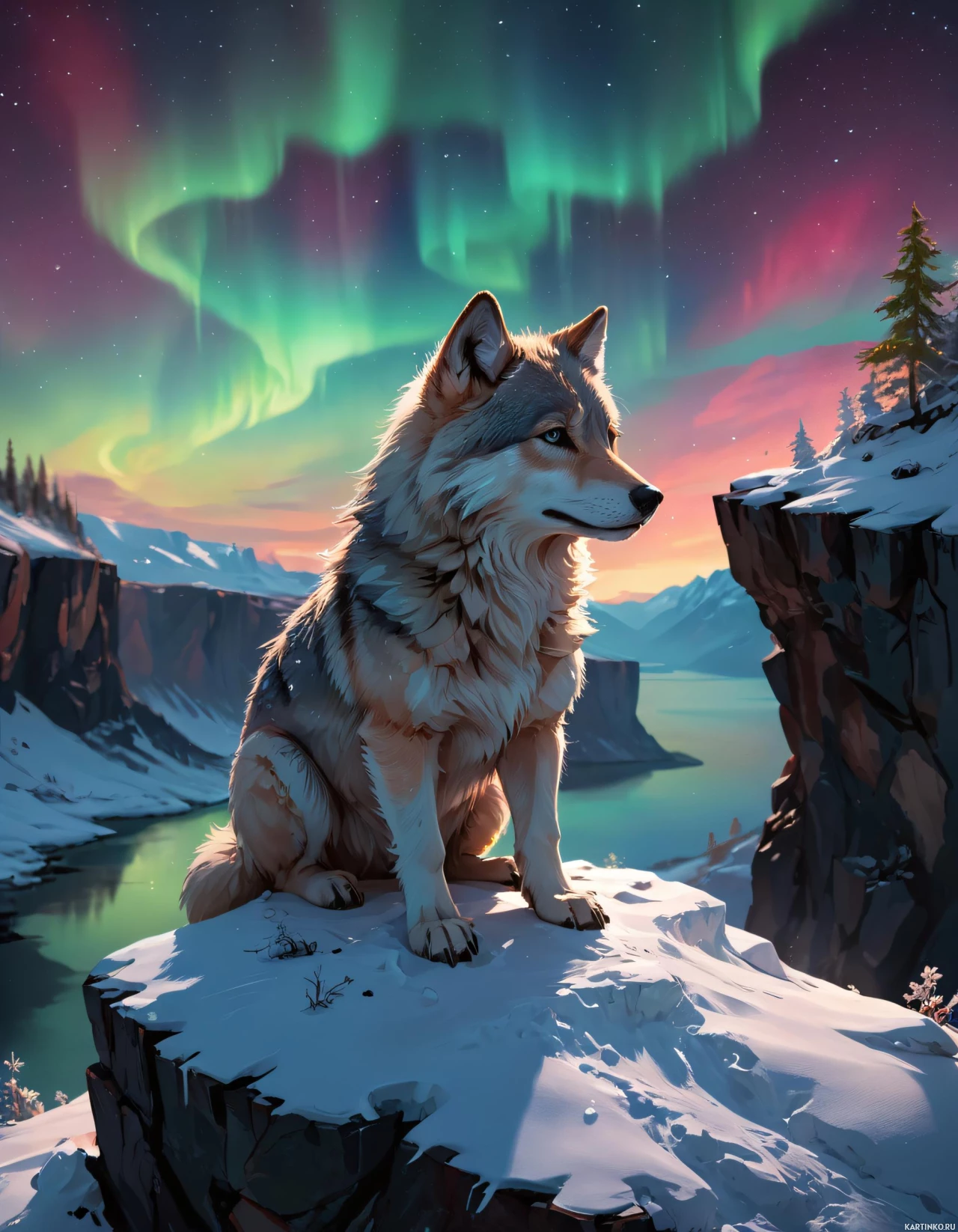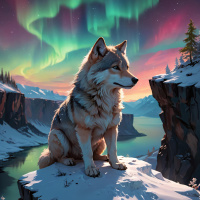 На картинке волк сидит на скалистом выступе, с которого открывается вид на безмятежный пейзаж. Небо над ним окрашено в оттенки оранжевого и фиолетового, словно предвещая рассвет или закат. Ниже, под этой яркой линией горизонта, озеро мерцает в лунном свете, добавляя сцене спокойную атмосферу. Снег покрывает землю вокруг волка, указывая на холодную погоду. На заднем плане высятся величественные горы, вершины которых подсвечены теми же небесными красками, что и небо. В целом, сцена передает ощущение мирной, уединенной жизни вдали от цивилизации.