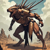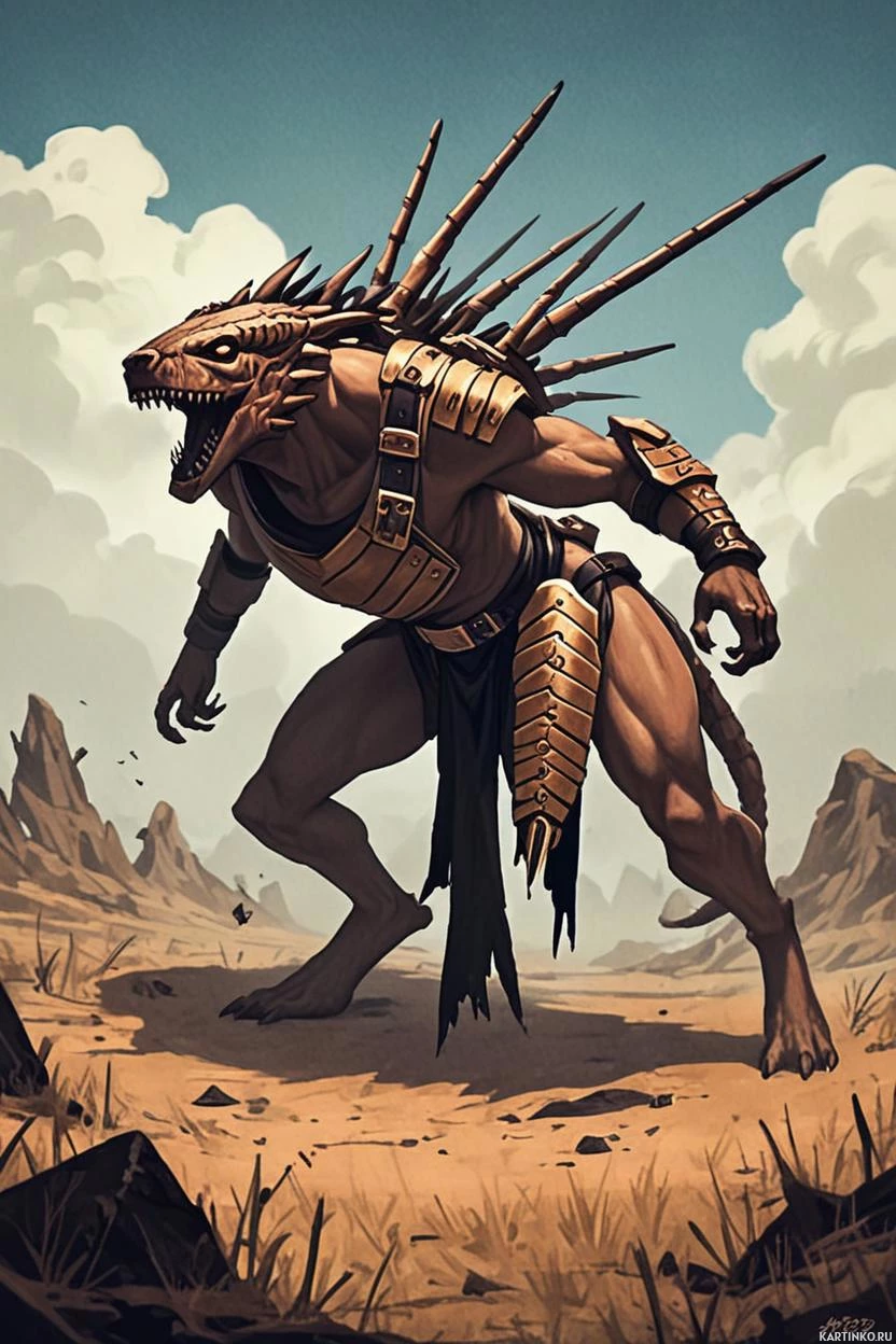 На картинке изображено фэнтезийное антропоморфное существо, стоящее в открытой пустынной местности. У него торс человека и тело волка или похожего пса с шерстью и мордой, как у собаки. Существо одето в безрубашечную броню с золотыми акцентами, включая нагрудник, наплечники и штаны. Его руки мускулистые и голые, в руке никакого оружия не видно. Хвост, кажущийся состоящим из торчащих волос или шерсти, торчит за его спиной. Пустынный ландшафт каменистый и скудно заселен растительностью, а небо затянуто облаками.