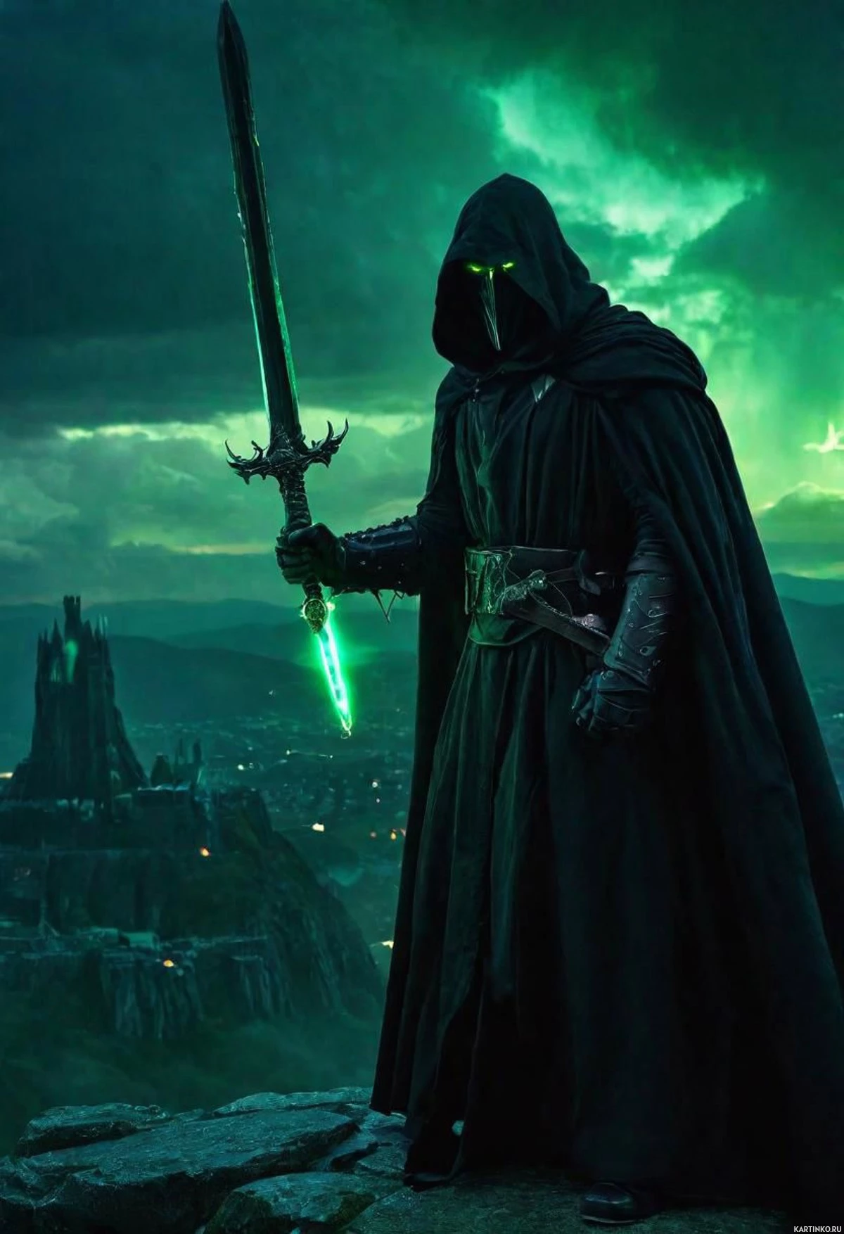 In the image, a figure stands on a rocky outcrop overlooking a castle. The figure is clad in dark robes and a cloak, with a hood casting shadow over their face. They hold a sword in one hand, which glows with an eerie green light that seems to emanate from the blade itself. Above them, the sky is filled with clouds that hint at the possibility of an impending storm. In the distance, a castle looms against the cloudy backdrop, adding to the overall fantastical atmosphere of the scene.