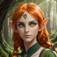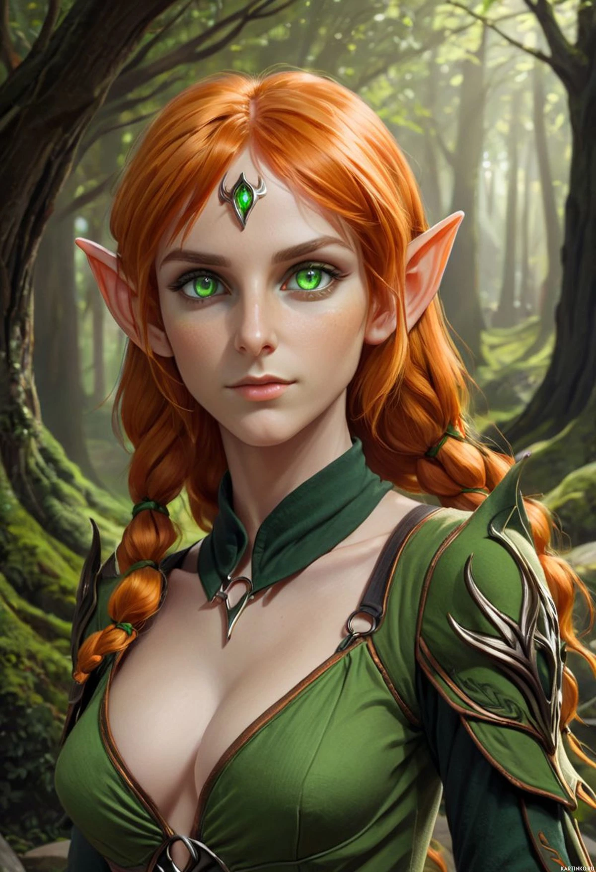На картинке изображен персонаж в стиле фэнтези с рыжими косичками, в зеленой броне с золотыми деталями. У персонажа заостренные эльфийские уши, а на заднем плане – лес с мшистыми камнями и деревьями. Картинка выполнена в деталях, персонаж показан от плеч до груди, хорошо просматривается текстура одежды и реалистичные черты лица.