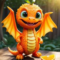 The image features a cartoonish depiction of a dragon character sitting on a rock. The dragon has orange scales, long wings, and a tail with small spikes. It is holding an orange in its front paws. The background suggests a natural environment with green foliage.