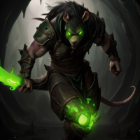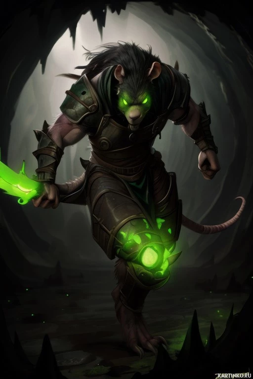 На картинке изображен антропоморфный крыс, сильный и мускулистый, в зеленом плаще и доспехах, с двумя светящимися зелеными волшебными мечами. За его спиной – темная пещера или туннель, освещенная зеленым светом, создающим мистическую атмосферу.