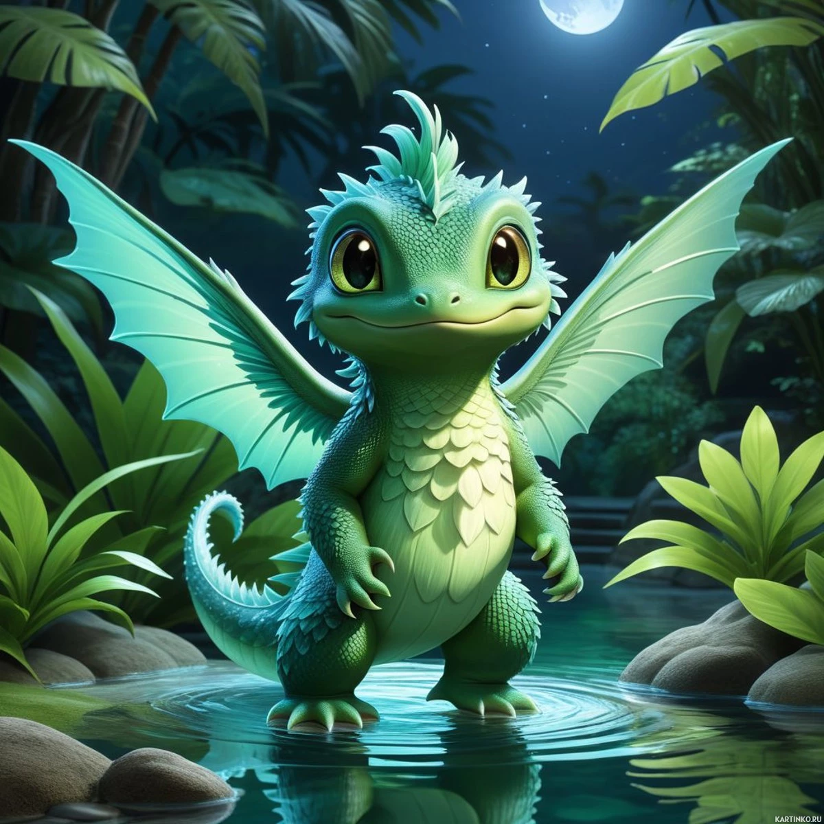 На картинке – яркое изображение фантастического мира. В центре стоит существо, похожее на дракона, с крыльями и чешуей, сочетающее признаки рептилии и млекопитающего. Дракон стоит на четвереньках в тихой реке, окруженный пышной зеленью под мягким светом луны, отбрасывающим длинные тени. У существа большие глаза, которые, кажется, сияют в ночном свете, а выражение лица спокойное и умиротворенное. Его окрас гармонирует с окружающей растительностью, создавая взаимодействие между ним и его окружением.