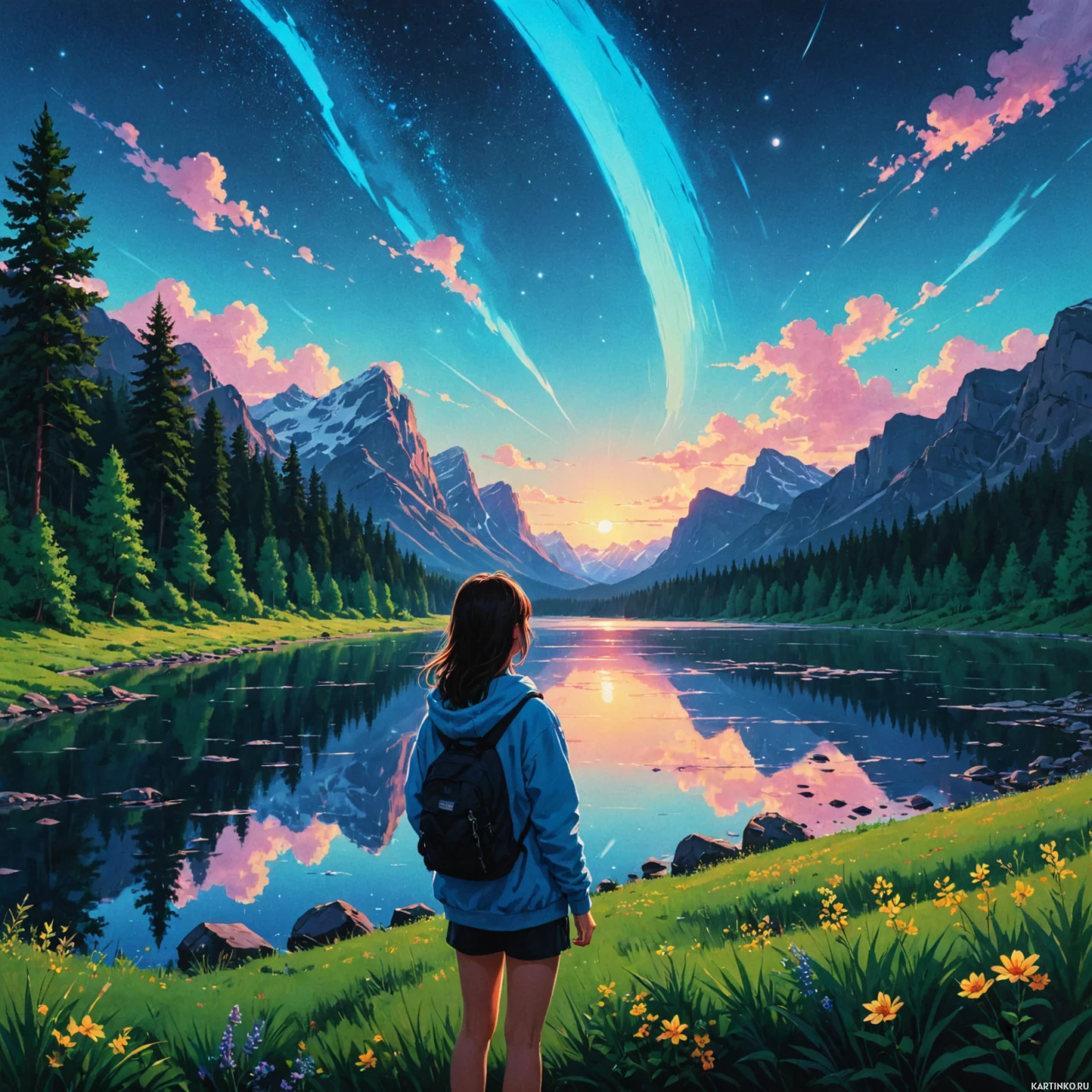 На картинке девочка стоит на берегу тихого озера на закате. Над ней – небо, залитое яркими оттенками розового и голубого, освещенное сиянием заходящего солнца. По небу тянутся падающие звезды, добавляя этой сцене безмятежной красоты. Она стоит спиной к зрителю, глядя на бескрайнюю водную гладь. На ней белая рубашка, на плечах рюкзак – словно она отправилась в путешествие или приключение. На заднем плане величественно вздымаются горы, завершая этот живописный пейзаж.