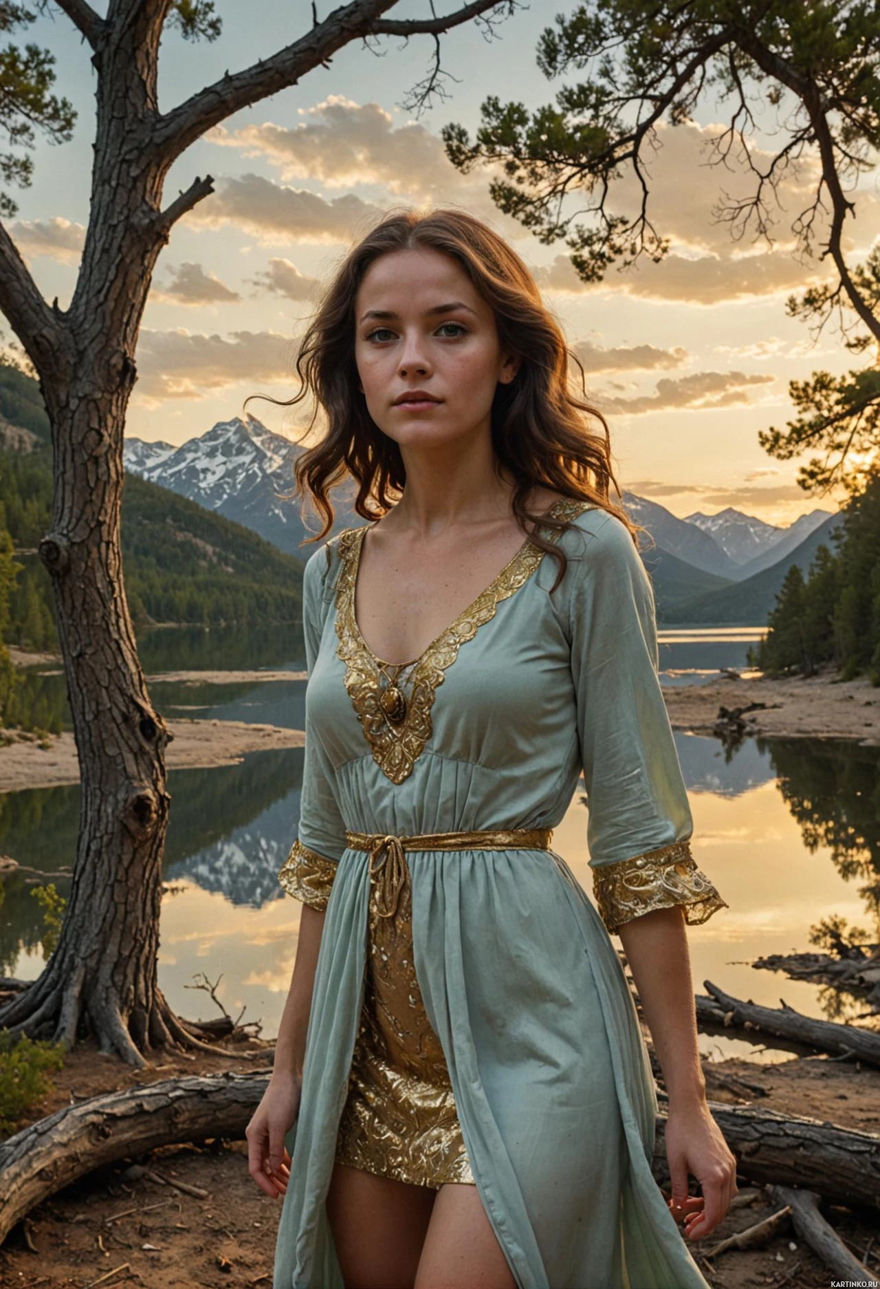 На картинке изображена женщина, стоящая на фоне природы, вероятно, на рассвете или закате, судя по теплому освещению и длинным теням, падающим на землю. На ней светлое, длинное платье с акцентом на талии и золотые туфли на высоком каблуке. Волосы у неё распущены, а взгляд направлен в сторону с невозмутимым выражением лица. На заднем плане – озеро или река, отражающие линию горизонта и гористый ландшафт вдалеке под слегка затянутым облаками небом.