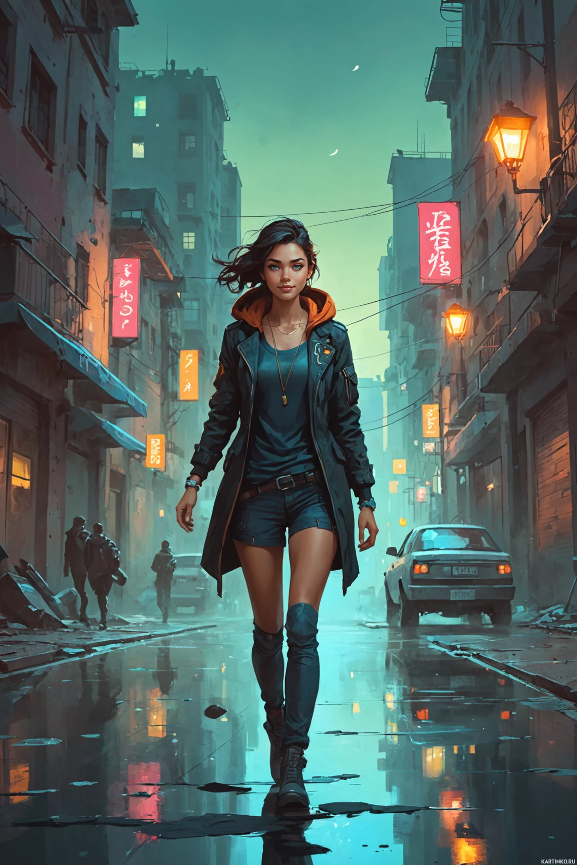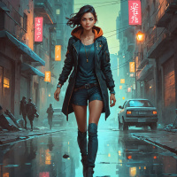 На картинке на первом плане – девушка с темными волосами. У неё короткая стрижка, она одета в черную кожаную куртку поверх синей кофты с красными деталями. Кажется, она в движении, идёт по залитому дождем переулку, напоминающему европейский город своей архитектурой. Справа в картинке видны два человека: один вооружён пистолетом, а у другого – тактический жилет или рюкзак. Место действия указывает на городскую среду в непогоду.