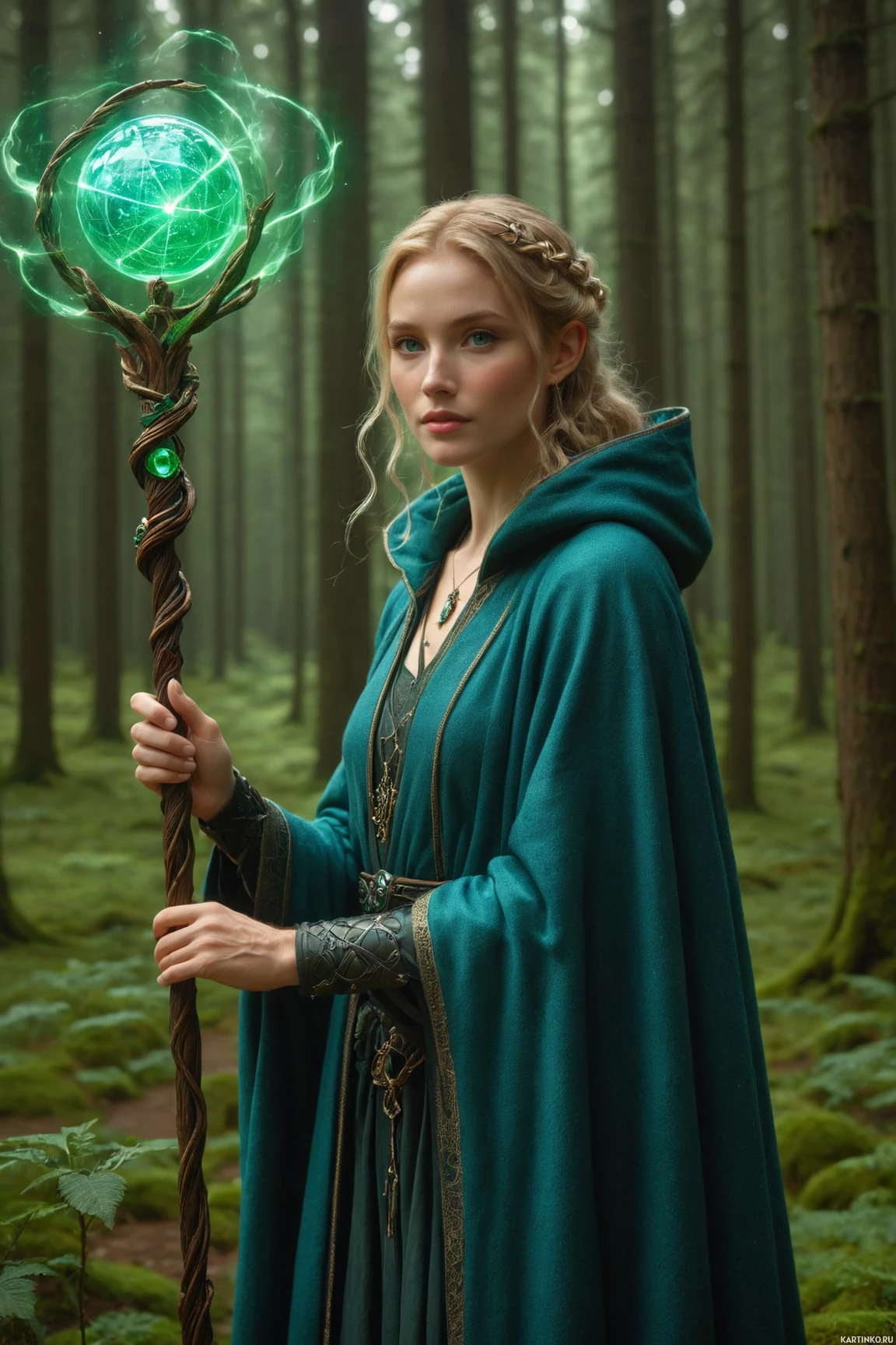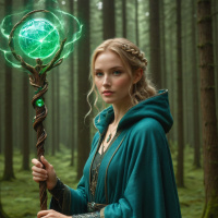 На картинке изображена молодая женщина с светлыми волосами, словно сошедшая со страниц фэнтези. Она стоит на лесной подстилке, усыпанной травой и мхом. В левой руке она держит волшебную палочку, от которой исходит разряд электрической энергии. На плечо накинуто зеленое плащ, ткань которого выглядит фактурной, возможно, из шерсти или похожего материала. Её правая рука вытянута в сторону зрителя, а выражение лица спокойное, но сосредоточенное на чем-то, чего нет в кадре.
