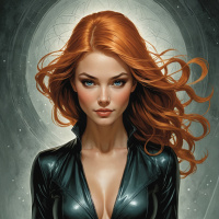 The image features a woman with red hair wearing a black superhero costume with large cleavage, suggesting a stylized and possibly fictional representation of a female character. Her gaze is directed off to the side, and she has a neutral expression on her face. She appears to be standing within an arched frame or portal-like structure that suggests a futuristic or superhero setting. The lighting highlights her figure and facial features, emphasizing her as the central focus of the image.