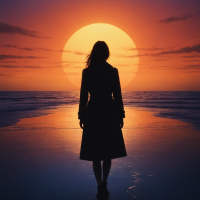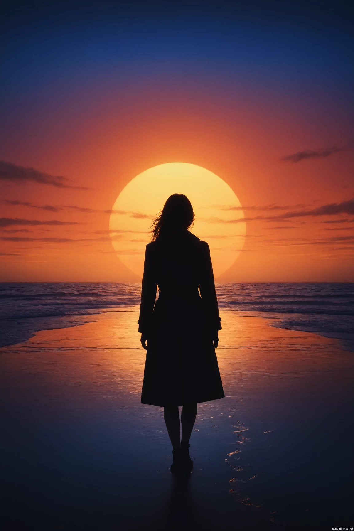Одинокая фигура, силуэтом вырисовывающаяся на фоне ярко-оранжевого заката, стоит на мокром, отражающем свет пляже, глядя на горизонт, где солнце частично скрыто облаками. Кажется, фигура задумалась или наблюдает за закатом. Картина выполнена в насыщенных оранжевых и красных тонах, характерных для вечернего пейзажа.