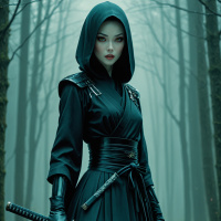 На картинке женщина в черном плаще с капюшоном и кожаном доспехе уверенно стоит на лесной тропе. В правой руке она держит меч и одета в кожаные перчатки без пальцев, украшенные кожаными ремешками. Высокие деревья с тонкими стволами окружают ее, их ветви переплетаются над головой, создавая жутковатую атмосферу. Поза и наряд женщины говорят о готовности к бою или, возможно, о каком-то фантастическом приключении.