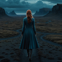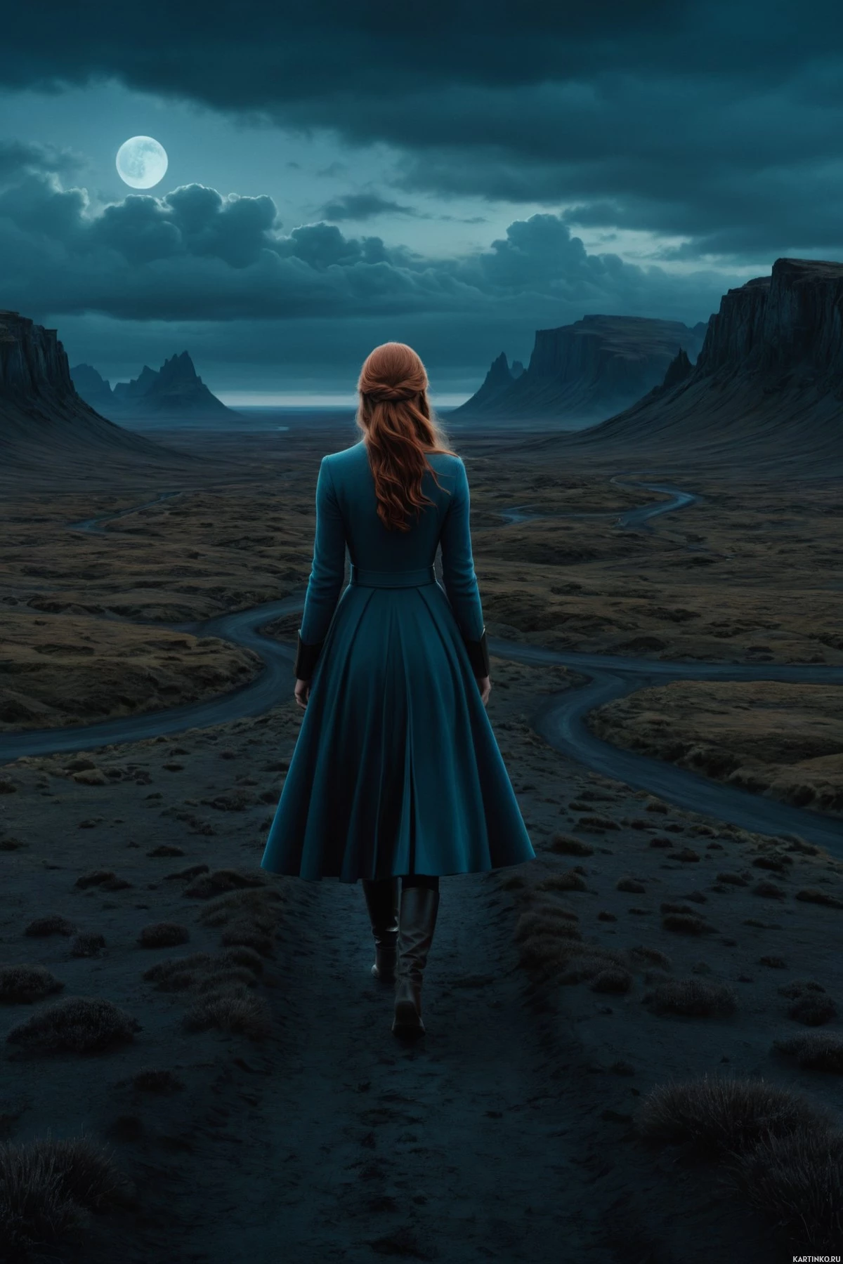 На картинке изображена стилизованная сцена, в центре которой — женская фигура. У неё рыжие волосы, и она одета в одежду, напоминающую исторический стиль, например, викторианский или эдвардианский, включая длинный плащ или пальто. Она стоит на безжизненном пейзаже, похожем на пустыню или засушливое плато, окружённая бескрайним пространством земли и камней, и вдалеке видна тропа. Небо изображено тёмным, что может говорить о позднем вечере или раннем утре, учитывая наличие облаков, подсвеченных снизу, вероятно, лунным светом. Вдалеке, под лунной ночью, видны силуэты скальных образований. Общее настроение картинки — несколько меланхоличное и созерцательное.