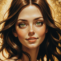 The image depicts a woman with long dark hair and striking blue eyes. She has a prominent nose and full lips, giving her a distinctive appearance. The woman is wearing an intricate golden-colored top that appears to be adorned with embellishments or jewels. Her gaze is directed straight at the viewer, conveying a sense of engagement or interaction. The background has a golden hue and features a pattern that could be interpreted as stylized leaves or feathers.