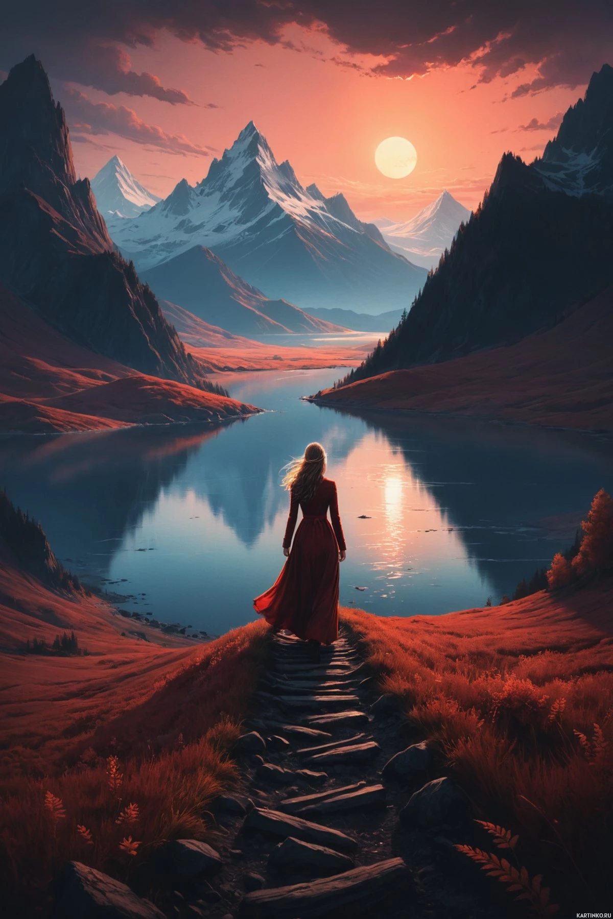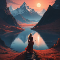 На картинке запечатлён тихий пейзаж: на закате человек стоит на тропинке. Спиной к зрителю, он одет в длинное платье, изящно ниспадающее на землю. Над ним – небо, окрашенное в оттенки оранжевого и красного у горизонта, что говорит о времени рассвета или заката. На заднем плане видны горы, а над ними — чистое голубое небо с облаками. На переднем плане — водная гладь, отражающая краски заката. Вдоль тропинки, где стоит человек, видны зелень и кустарники, создающие атмосферу покоя. Свет мягко подчёркивает тени и усиливает тёплые тона сцены.