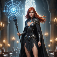 На картинке изображена рыжеволосая женщина, стоящая в, кажется, богато украшенном, темном коридоре. На ней доспехи, сочетающие в себе элементы фэнтези и средневековья: шлем с крыльями и плащ с замысловатым орнаментом. В правой руке она держит посох с синим светящимся камнем на конце, что намекает на магические способности или роль волшебницы в фэнтезийном мире. Женщина смотрит влево, и…