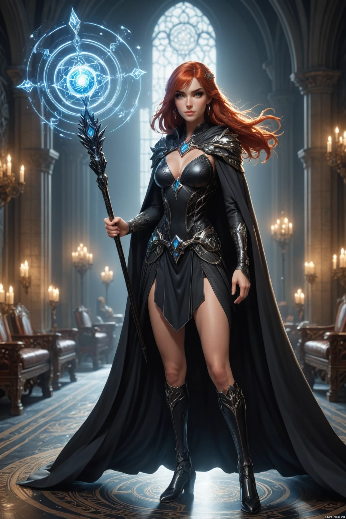 The image depicts a woman with red hair standing in what appears to be an ornate, dark hallway. She is wearing armor that has elements of fantasy and medieval design, including a helmet with wings protruding from the sides and a cape with intricate patterns on it. In her right hand, she holds a staff with a glowing blue gem at its top, suggesting magical properties or a role as a wizard or mage in a fantasy setting. The woman is looking to her left, and