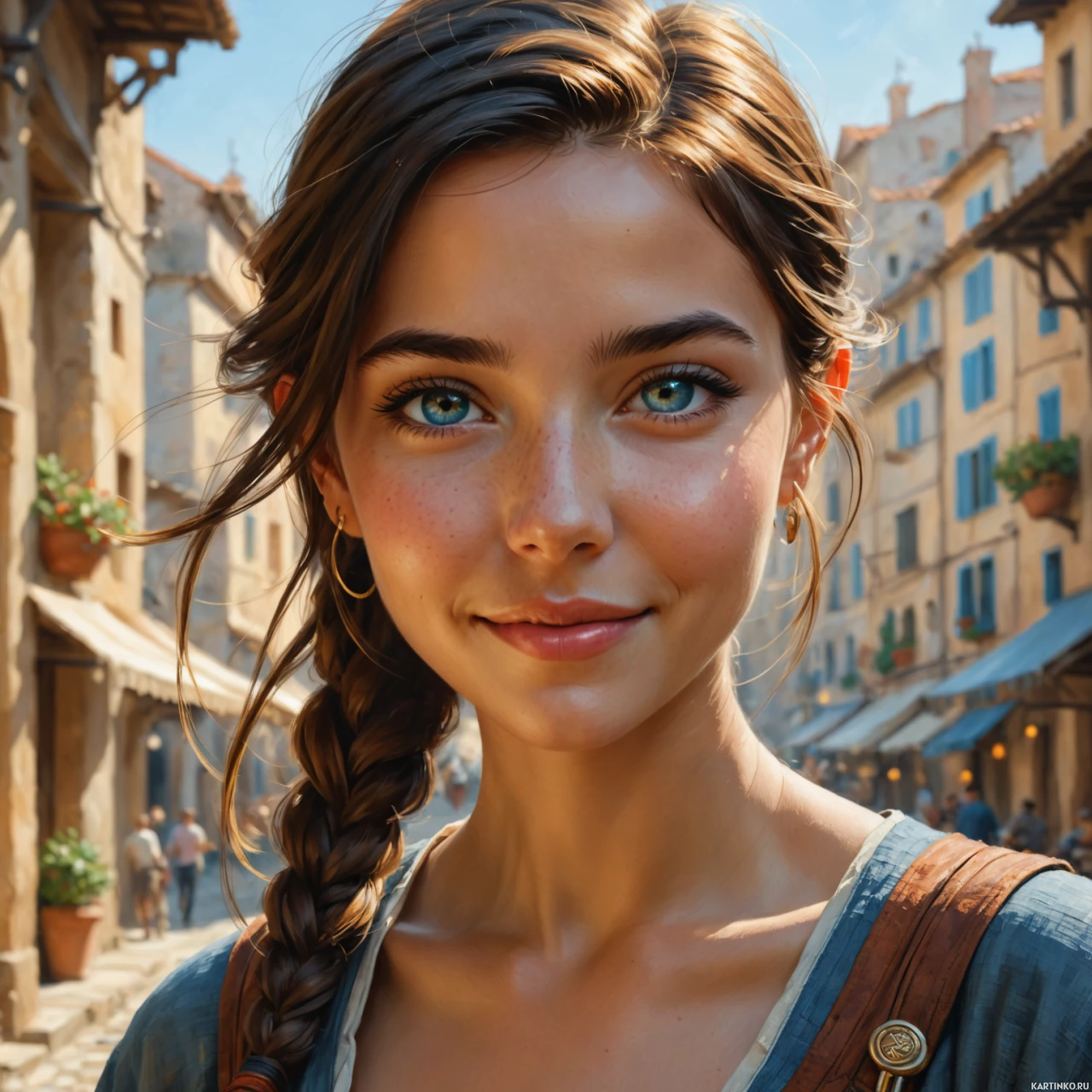 На картинке запечатлена молодая женщина со средней длиной волос, уложенных мягкими волнами. У нее светлая кожа и выразительные голубые глаза, подчеркнутые макияжем. Черты лица: четкие брови, пухлые губы и небольшой нос. Волосы собраны в легкую косу, ниспадающую на плечи. Кожа выглядит безупречной, практически без единого изъяна, что может говорить о ретуши или обработке изображения. Она смотрит прямо в камеру с легкой улыбкой, демонстрируя ровные зубы и нежно-розовые губы. Выражение лица нейтральное, но дружелюбное. У нее светлый персиковый оттенок кожи, без веснушек или родинок. Ресницы длинные и густые, что добавляет элегантности ее внешности. Глаза широко открыты, она активно смотрит на зрителя. Макияж включает в себя четко очерченные брови, пухлые губы и безупречную кожу без единого пятнышка. Тени для век выглядят мягкими и естественными. На лице и теле нет видимых татуировок или пирсинга. Волосы уложены в косу, ниспадающую на плечи. Цвет волос – каштановый с золотистыми прядями, которые придают глубину и насыщенность. Губы нежно-розовые и пухлые, подчёркнутые помадой. Зубы выглядят белыми и ровными. У нее светлый персиковый оттенок кожи, без веснушек или родинок. Ресницы длинные и густые, что добавляет элегантности ее внешности. Глаза широко открыты, она активно смотрит на зрителя. Макияж включает в себя четко очерченные брови, пухлые губы и безупречную кожу без единого пятнышка. Тени для век выглядят мягкими и естественными. На лице и теле нет видимых татуировок или пирсинга.