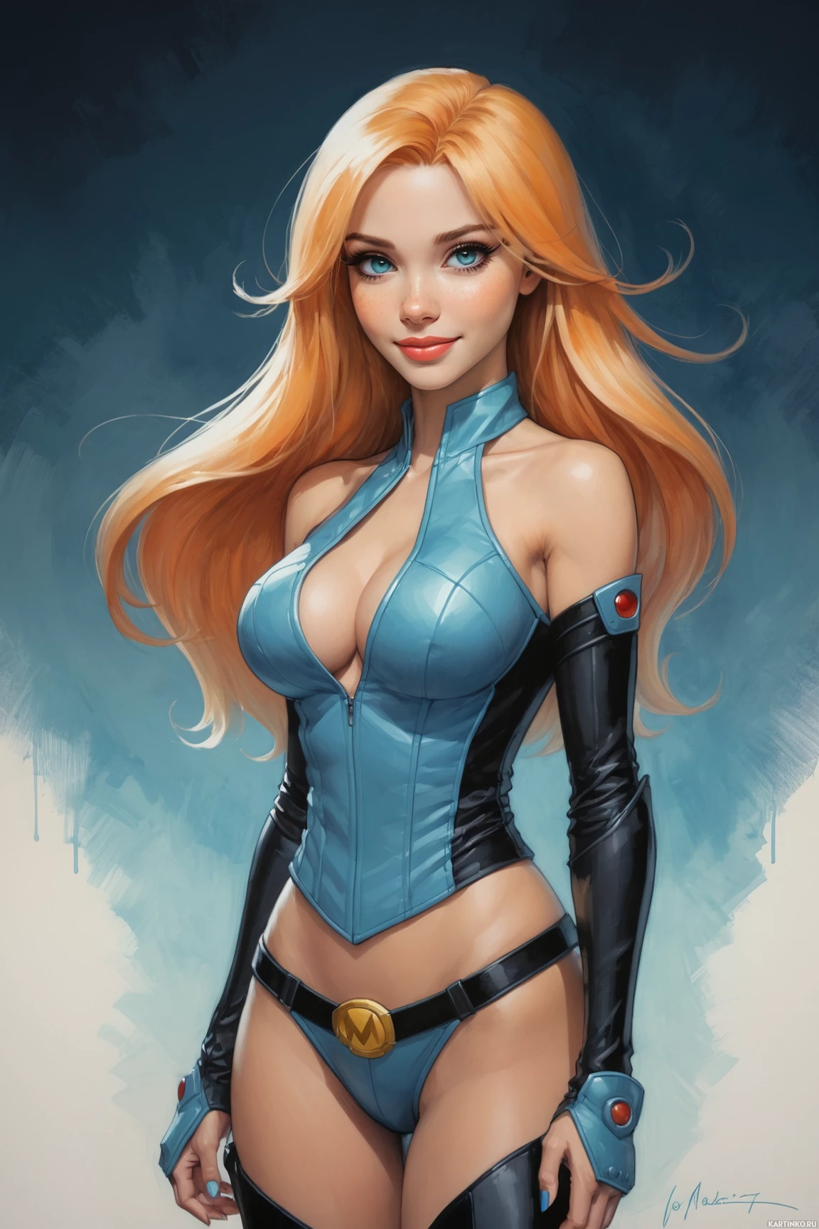 На картинке изображена девушка с блондинистыми волосами. У неё пышная грудь, а на ней обтягивающий синий комбинезон. Детали костюма намекают на футуристическую или супергеройскую тематику, включая звездообразный узор на левой стороне груди. В целом, картинка выполнена в стиле цифрового искусства с динамичными мазками и акцентами, придающими ей живописный эффект.