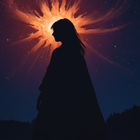 the night sky. Her hair is long and appears to be flowing outwards due to some form of energy or motion emanating from her head. This energy takes the shape of an explosion or burst, giving off warm colors that contrast against