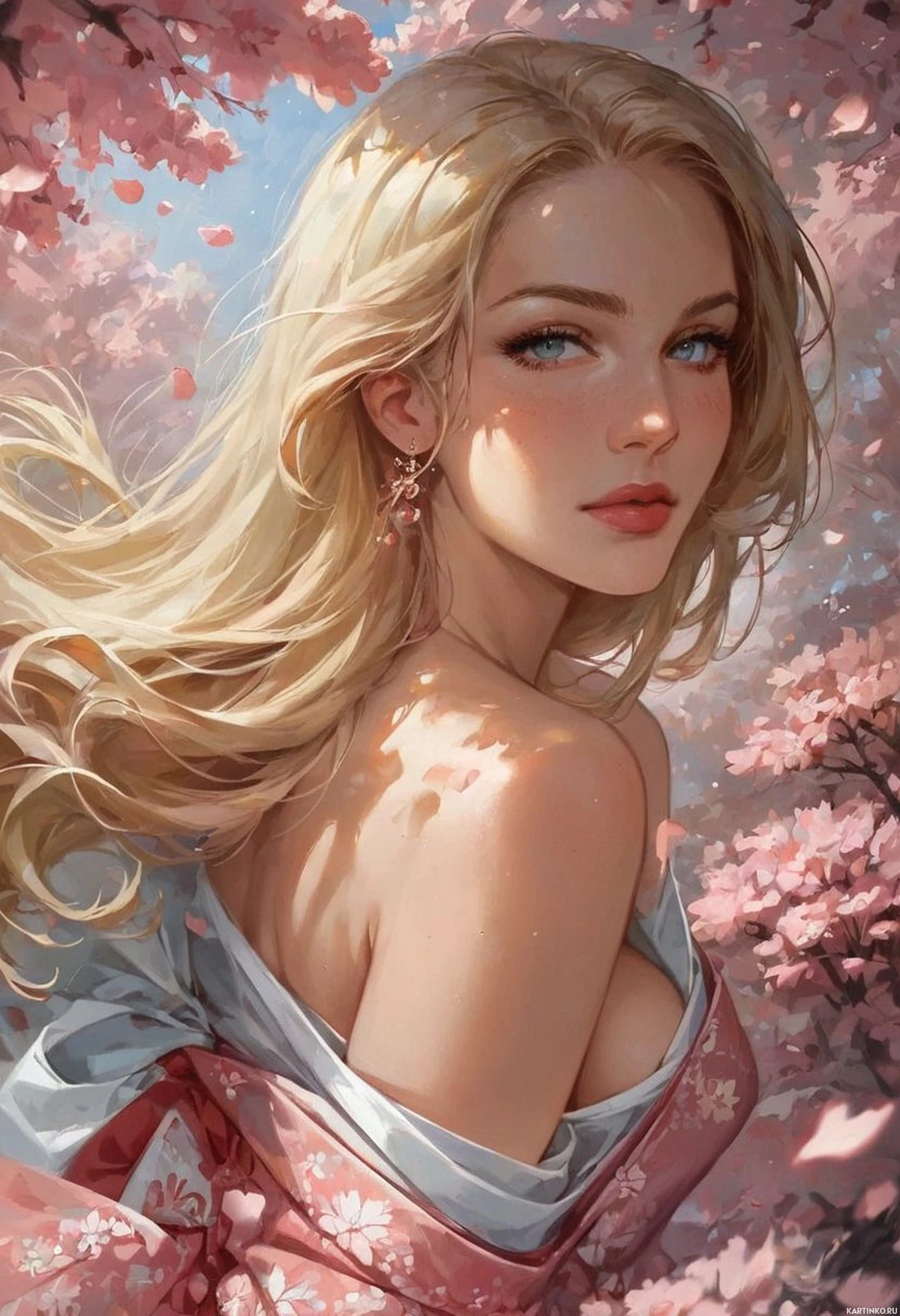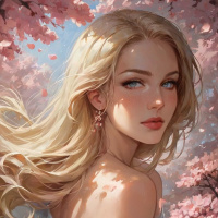 The image depicts a female character with blonde hair styled in loose waves that fall over her shoulders. She has rosy cheeks and is looking directly at the viewer with a gentle expression. Her eyes are wide and appear to have some color, possibly blue or green, which contrasts against her pale skin tone. The character is wearing a red garment with intricate designs on the bodice, suggesting an elegant or fantasy-inspired setting. In the background, there's a pink blossom tree with blooming flowers that fill the sky with hues of pink and soft lighting. The artwork has a high level of detail and color depth, indicating it could be from a video game or a piece of digital art designed to evoke a fantasy theme.