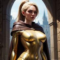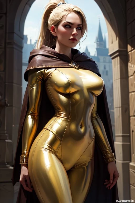 The image features a female character portrayed in a realistic digital art style. She has blonde hair and a confident stance, standing upright with her hands resting on her hips. Her outfit consists of a high-quality, shiny gold body suit with intricate details, complemented by what appears to be a cape or robe in a dark color that drapes over one shoulder. The character is standing in front of an architectural structure resembling a castle gate, which suggests a medieval setting.