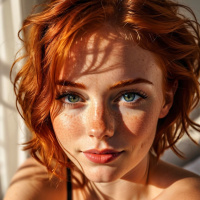 На картинке запечатлена молодая женщина с рыжими волосами, смотрящая прямо в камеру с мягкой улыбкой. У нее светлая кожа, и она одета в черную майку без рукавов. Поза указывает на то, что это может быть портрет или фотография, сделанная в непринужденной обстановке. Освещение естественное, падающее с верхнего левого края, отбрасывая тень на ее правое плечо. Фон нейтральный, без каких-либо выделяющихся деталей, чтобы не отвлекать внимание от модели.