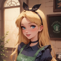 The image depicts a character that appears to be an animated or digital illustration of a young female with long, blonde hair and striking blue eyes. She is wearing a green apron over a navy top and has cat-like ears on her head. Her expression is neutral, and she is holding a coffee cup in her hand, which is raised towards her face as if she's about to take a sip. The background suggests an indoor setting with warm lighting and what could be a chalkboard or board on the wall in the distance.