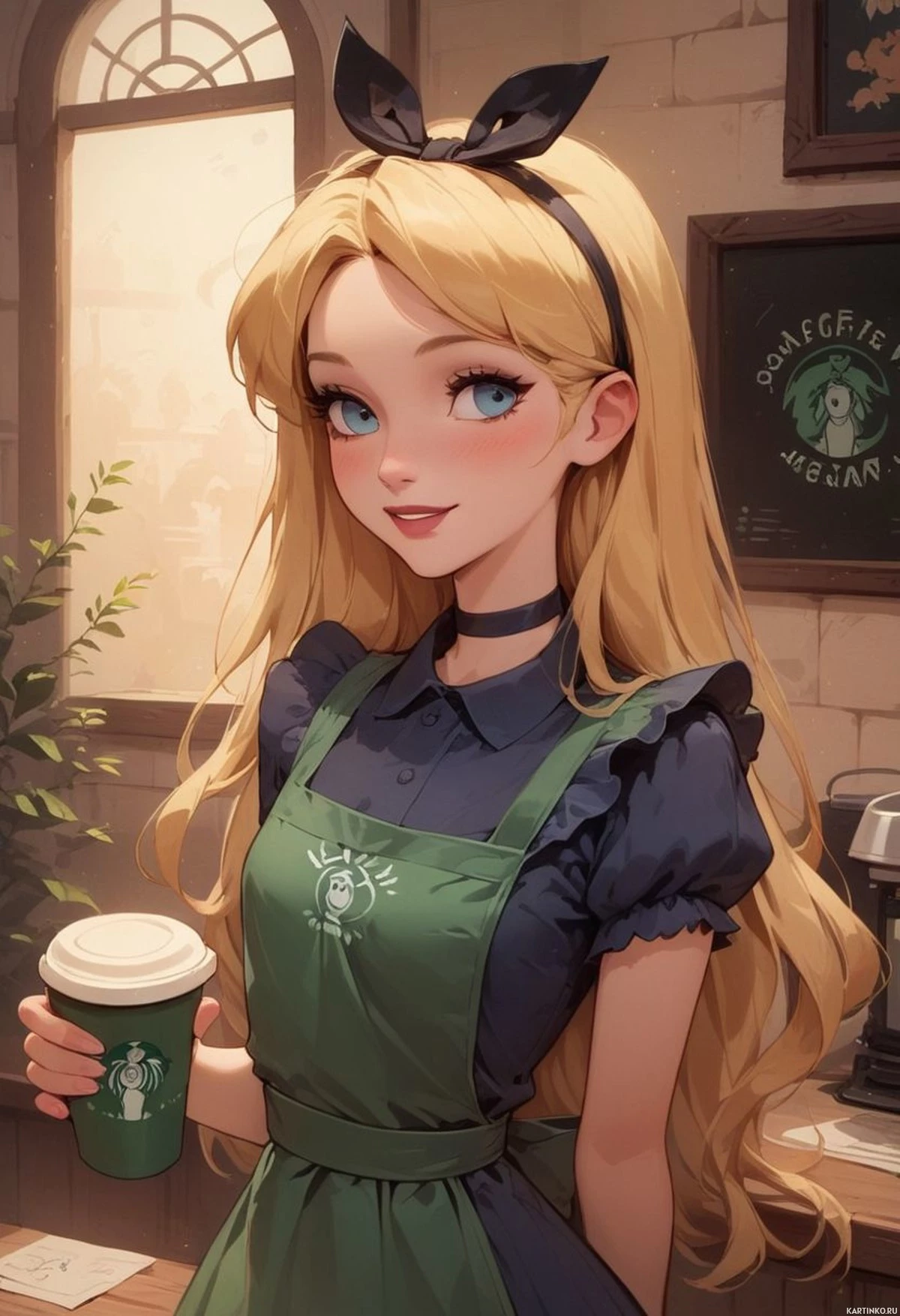 На картинке изображен персонаж, похоже, анимированная или цифровая иллюстрация молодой девушки с длинными светлыми волосами и выразительными голубыми глазами. На ней зеленый фартук поверх темно-синей кофты, а на голове — кошачьи ушки. Выражение лица нейтральное, в руке она держит чашку кофе, которую поднимает к лицу, словно собирается сделать глоток. На заднем плане виднеется интерьер с теплым освещением и, возможно, доска или грифельная доска на стене.