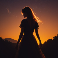 The image features a silhouette of a girl standing at a cliff edge during sunset or sunrise. She is looking out over a landscape that includes a body of water, possibly a lake or river, and distant mountains under a starlit sky. She appears to be wearing a flowing dress with a high neckline. The artwork conveys a sense of contemplation or anticipation.