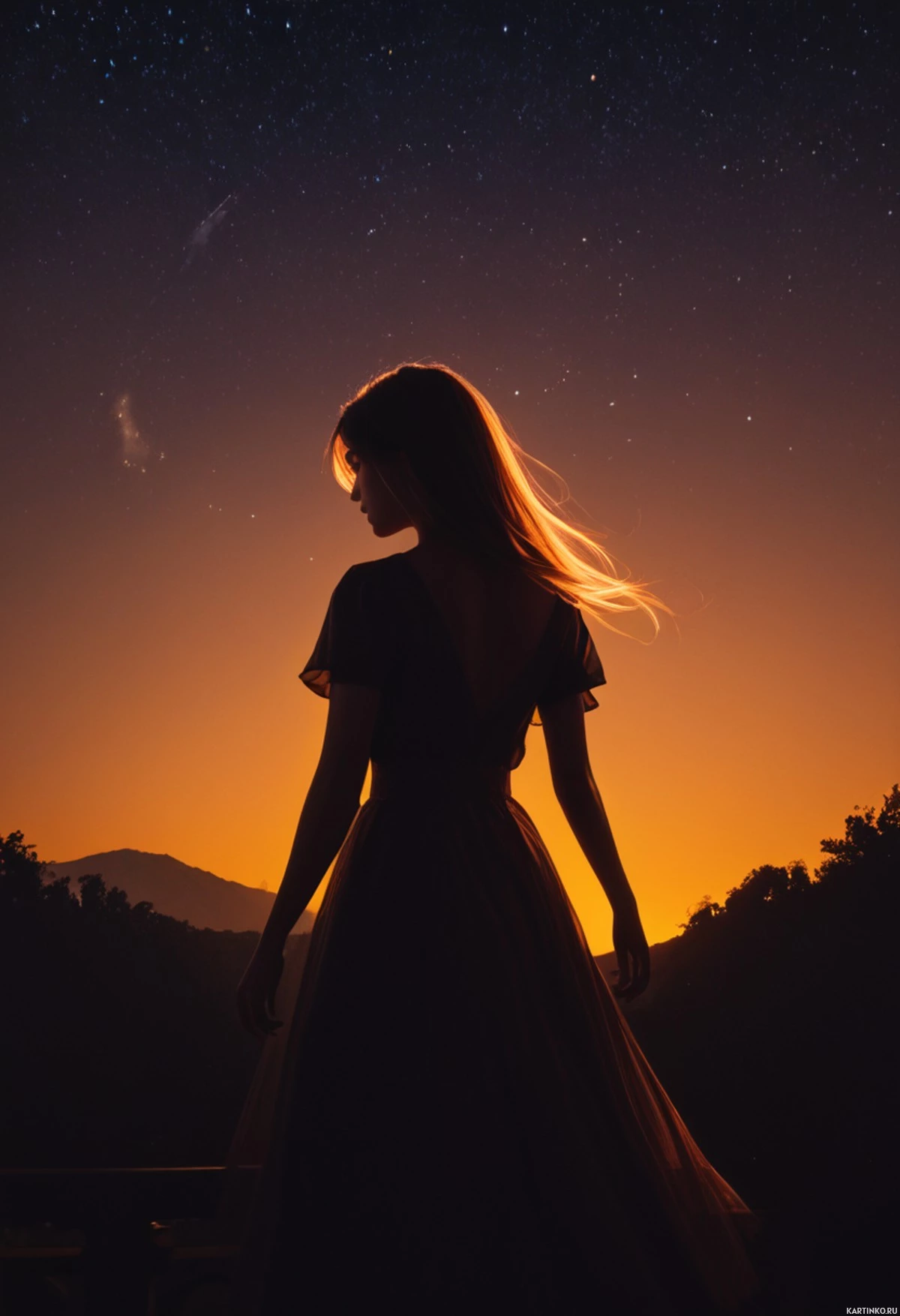 На картинке – силуэт девушки, стоящей на краю обрыва во время заката или рассвета. Она смотрит на пейзаж, где виднеется водная гладь, возможно, озеро или река, и далёкие горы под усыпанным звёздами небом. На ней – струящееся платье с высоким воротником. Картина передаёт ощущение раздумий или ожидания.