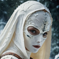 In the image, a person is depicted wearing a hood and a mask that covers the entire head. The attire appears to be historical or fantasy-inspired, featuring what seems like armor pieces with buckles and straps. There are snowflakes falling in front of the individual, indicating cold weather conditions. The person is looking directly at the camera with a neutral expression on their face.