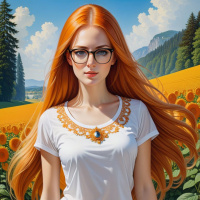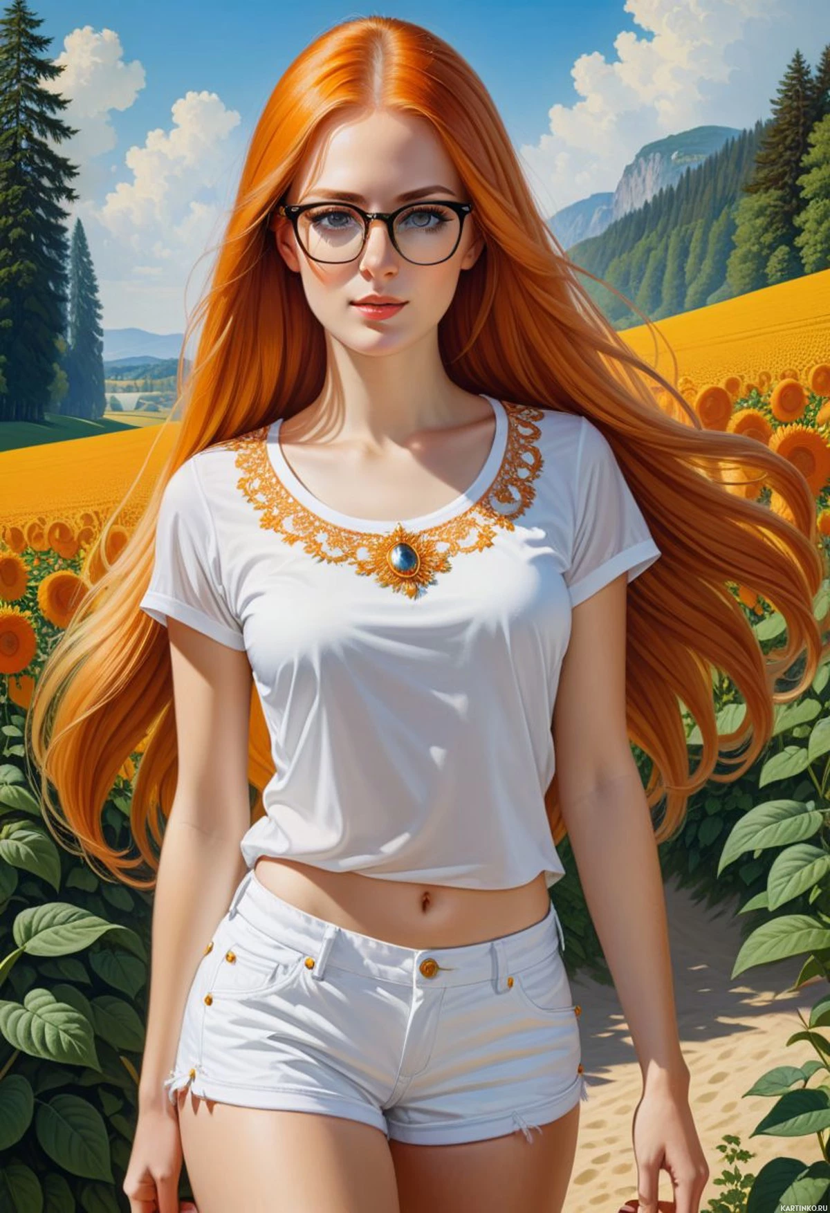 На картинке молодая женщина с ярко-рыжими волосами и в очках. На ней белая майка и джинсовые шорты. На заднем плане – живописное поле золотых подсолнухов под ясным небом с редкими облаками.