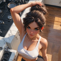 In this image, a young woman with shoulder-length dark hair is captured. She has a muscular physique and her hands are placed on her head. The setting appears to be a kitchen, with wooden floors and cabinets visible in the background. There's also an oven that can be seen.