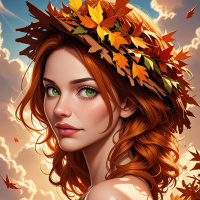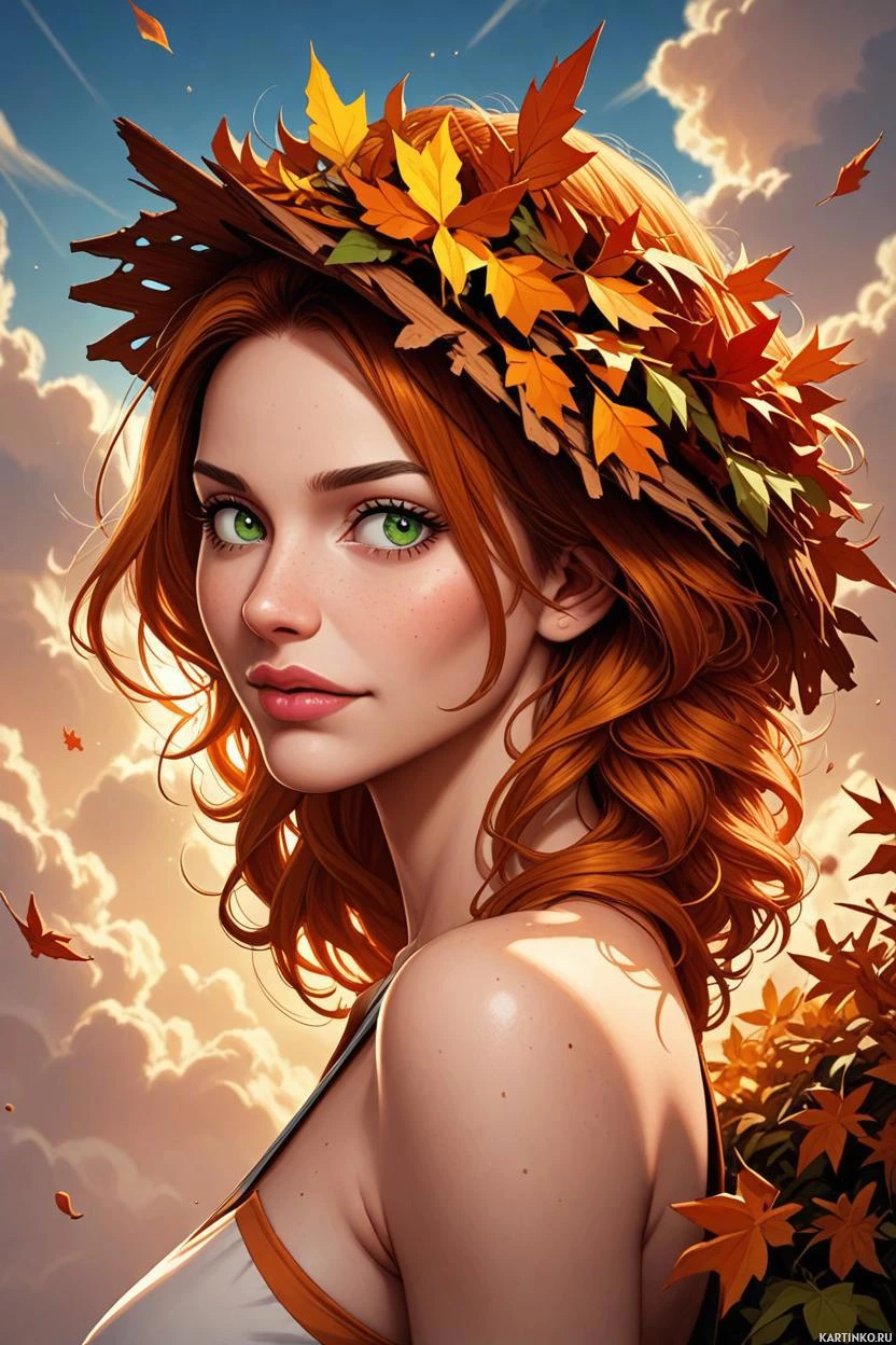 red hair, wearing a headpiece adorned with what appears to be autumn leaves. She has a gentle and contemplative expression on her face. Her attire includes a light-colored garment that seems to have
