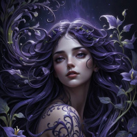 The image depicts a stylized female figure with long, flowing purple hair and striking blue eyes. She has a fair complexion and appears to be in her late teens or early twenties. Her facial expression is neutral and she seems to be gazing directly at the viewer. She is adorned with intricate jewelry, including what seems to be an ornate bracelet on her left wrist and a ring on her right hand. The attire includes what appears to be a fantasy-inspired costume or dress, featuring elements like lace, ribbons, and perhaps a corset or bodice with a sheer overlay in a darker shade of purple. The background is dark and starry, suggesting a night sky. There are small flowers blooming in front of the figure, which have a soft, lavender hue that complements her hair color. The overall tone of the image is one of fantasy or magic, evoking a sense of otherworldly beauty and enchantment.