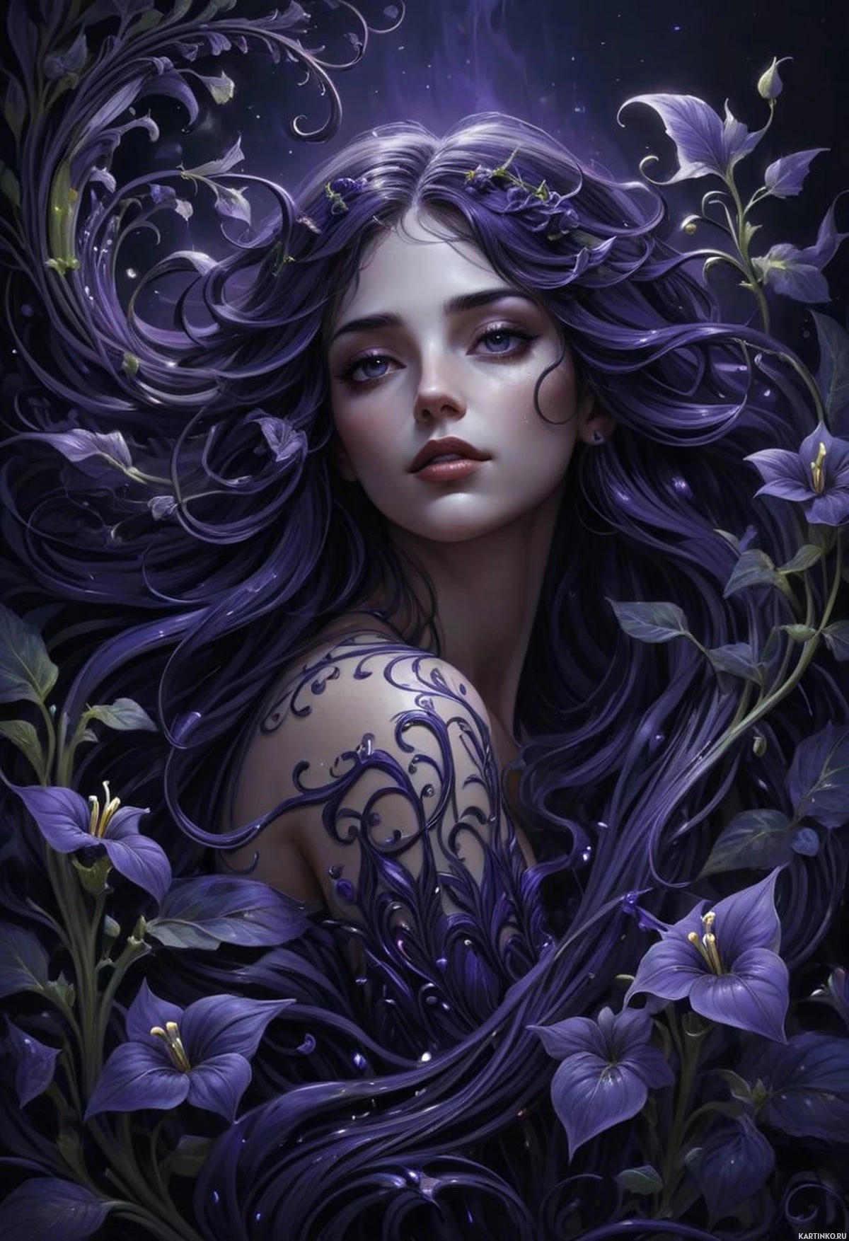 На картинке изображена стилизованная женская фигура с длинными, струящимися фиолетовыми волосами и пронзительными голубыми глазами. У нее светлая кожа, и судя по всему, ей около восемнадцати-двадцати лет. Выражение лица нейтральное, и кажется, она смотрит прямо на зрителя. Её украшают изысканные украшения, включая, по всей видимости, резной браслет на левом запястье и кольцо на правой руке. На ней надет костюм или платье в стиле фэнтези, с элементами кружева, лент, а также, возможно, корсета или лифа с полупрозрачной накидкой более темного оттенка фиолетового. Фон тёмный, усыпан звёздами, что напоминает ночное небо. Перед фигурой расцвели маленькие цветы нежного лавандового оттенка, оттеняющие цвет её волос. Общее настроение картинки – сказочное или магическое, вызывающее ощущение неземной красоты и очарования.