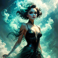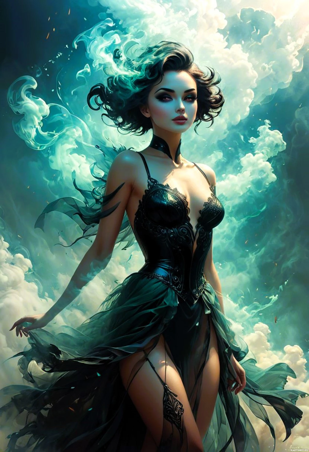 The image features a fantasy-themed female character. She has dark hair and is wearing makeup that includes smoky eyes, which could be described as "smoke." She is adorned with various accessories such as choker, bracelets, and what appears to be a feather crown or headdress with dark feathers. The character's attire consists of a bodysuit with a plunging neckline that has intricate detailing on the shoulders and torso. Her skin is visible, suggesting she might have fair complexion. The background is dramatic with cloud-like elements in shades of blue, gray, and white, evoking a sense of mysticism or otherworldly atmosphere. The overall composition suggests it could be an illustration for fantasy literature or video game artwork.