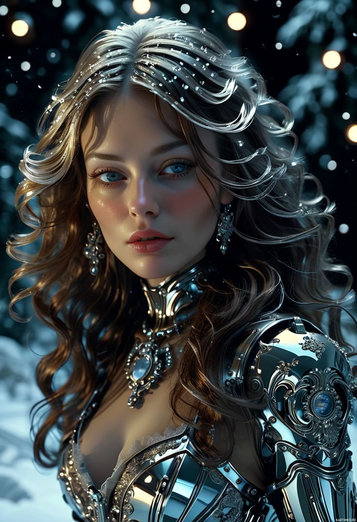 На картинке изображена очень детализированная и стилизованная женская фигура. У неё длинные, струящиеся волосы с прядями, которые кажутся золотистыми. Выражение её лица нейтральное, а глаза – поразительно голубые. На ней, похоже, сложный серебряный доспех или броня, покрывающий верхнюю часть груди, плечи и руки, плавно переходящий в детализированное металлическое ожерелье или украшение на шее. У персонажа заострённые уши, что намекает на эльфийский или фэнтезийный дизайн. У неё розовые губы и румяные щёки, что добавляет фантастичности картине. Фон тёмный, с едва заметными намёками на снежинки в воздухе, создающими зимнюю или холодную атмосферу.