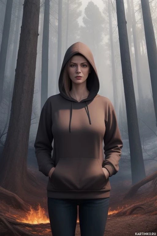На картинке изображена женщина, стоящая в том, что похоже на лес ночью. На ней толстовка с капюшоном, и она смотрит прямо в камеру с серьезным выражением лица. Вокруг – деревья, темнота которых сливается с ночным небом. На заднем плане видны отблески огня или тлеющие угли, что может говорить о костре неподалеку или даже о какой-то опасности.