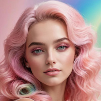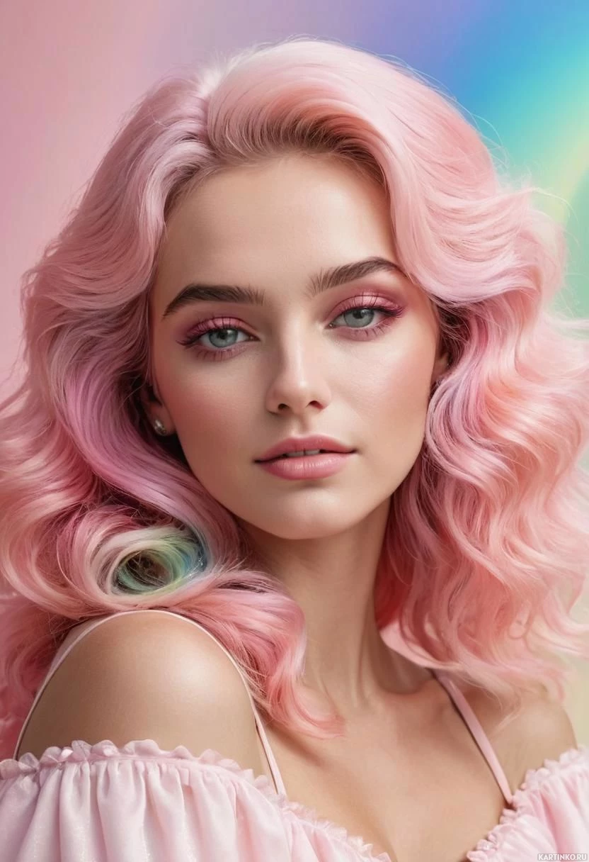 На картинке – портрет человека с розовыми волосами, уложенными так, что они обрамляют лицо, на котором застыло спокойное выражение. У человека видны брови и ресницы, а в макияже, похоже, использованы тени и помада. На нём светлая розовая или бежевая ткань, напоминающая блузку с короткими рукавами и кружевной отделкой на шее. Фон – градиент синего и зеленого цветов в верхней части, переходящий в насыщенный фиолетовый в нижней. В правом верхнем углу, позади головы человека, заметен едва уловимый эффект радуги, добавляющий картине лёгкую сказочность.