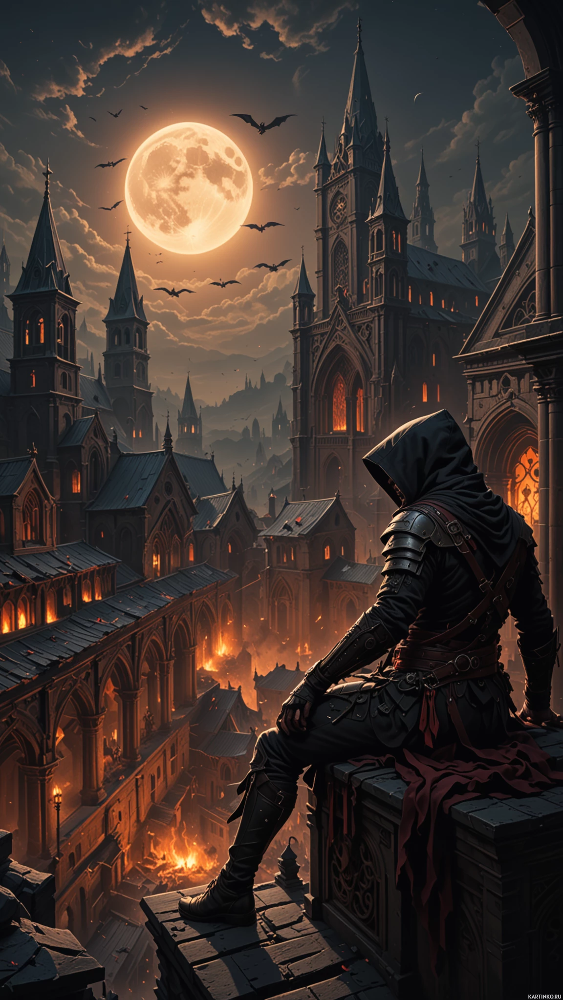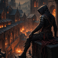 На картинке изображен персонаж, сидящий на выступе и смотрящий на ночной город. Город выглядит как декорации к средневековой эпохи: мощеные улочки, здания с остроконечными крышами и арками, атмосфера запустения. Из многочисленных окон зданий виден огонь, что говорит о беде или смятении. Персонаж в капюшоне одет в плащ с красной лентой, перекинутой через плечо, что придает ему загадочный и, возможно, героический вид. Заходящее солнце отбрасывает длинные тени, создавая драматичную атмосферу.