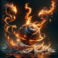 The image features a fantastical depiction of an artifact that appears to be both ancient and technologically advanced. At the core, there is a round object with intricate designs resembling metal and jewels. Surrounding this central sphere are tendrils that seem to be made of fire or magma, curling upward in a spiraling pattern. These tendrils give the impression of an organic growth around the artifact. The background is dark, which highlights the bright, glowing colors of the artifact and its fiery tendrils. There are also small sparks or flames floating around the scene.